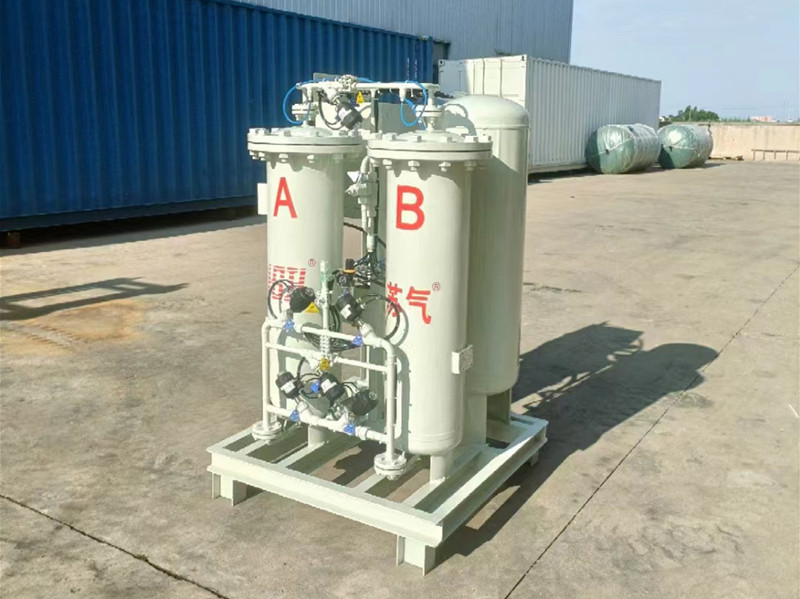 環(huán)境空氣經壓縮凈化,除去油、水、塵后,進入由兩個裝填有碳分子篩的吸附塔組成的變壓吸附裝置。壓縮空氣由下至上流經吸附塔,其間氧分子在碳分子篩表面吸附,氮氣由吸附塔上端流出,進入粗氮緩沖罐,經過一段時間后,吸附塔中碳分子篩被吸附的氧飽和,需進行再生。再生是通過停止吸附步驟,降低吸附塔壓力來實現(xiàn)的。兩個吸附塔交替進行吸附和再生,從而確保氮氣的連續(xù)輸出。