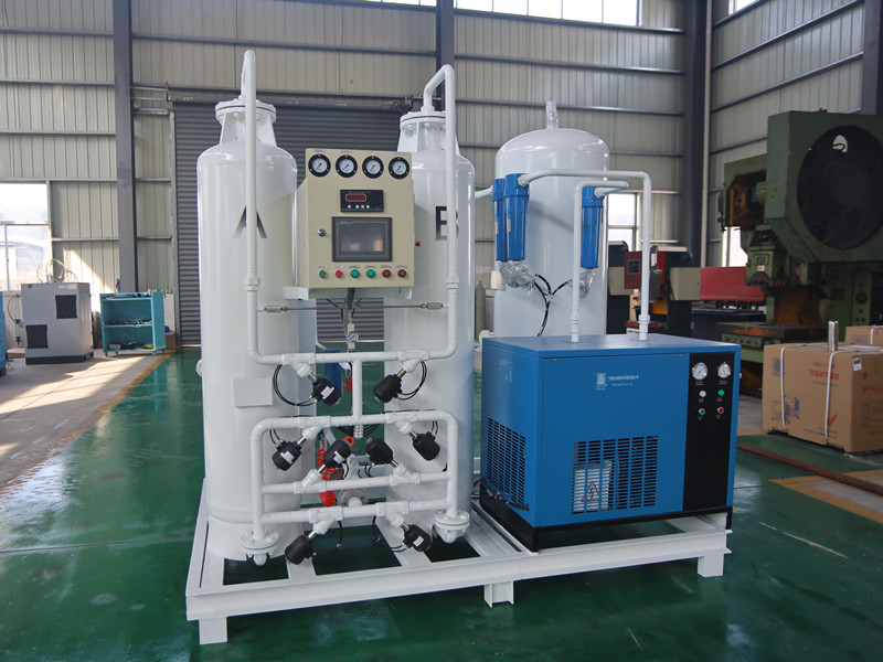 變壓吸附制氧裝置以潔凈的壓縮空氣為原料,采用高品質(zhì)的沸石分子篩作為吸附劑,在一定的壓力下,從空氣中制取氧氣。經(jīng)過純化干燥的壓縮空氣,在吸附器中進(jìn)行加壓吸附、減壓脫附。由于空氣動力學(xué)效應(yīng),氮在沸石分子篩微孔中擴(kuò)散速率遠(yuǎn)大于氧,氮被沸石分子篩優(yōu)先吸附,氧在氣相中被富集起來,形成成品氧氣。然后經(jīng)減壓至常壓,吸附劑脫附所吸附的氮氣等雜質(zhì),實現(xiàn)再生。一般在系統(tǒng)中設(shè)置兩個吸附塔,一塔吸附產(chǎn)氧,另一塔脫附再生,通過PLC程序控制器控制氣動閥的啟閉,使兩塔交替循環(huán),從而取得純度較高的氧氣(93%±3%)。