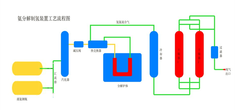 液氨經(jīng)氨減壓閥減壓,進(jìn)入水汽化器,然后進(jìn)入熱交換器和氨分解出來的氫氣進(jìn)行熱量交換,進(jìn)入分解爐體里,分解成氫氮混合氣,出來的熱氣體和氨進(jìn)行熱量交換,再進(jìn)入水冷卻器冷卻后,即可送到使用點。